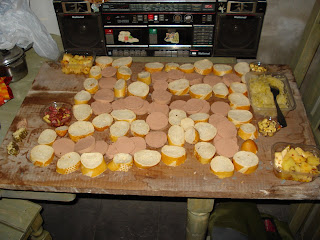 Bruno ofrece comida a Shmuel cuando este viene obligado a casa de Bruno a limpiar unas copas. En la película le ofrece lo que parece un bollo, un pastel... en el libro se dirige a la nevera y corta tres trozos de pollo relleno para su amigo.